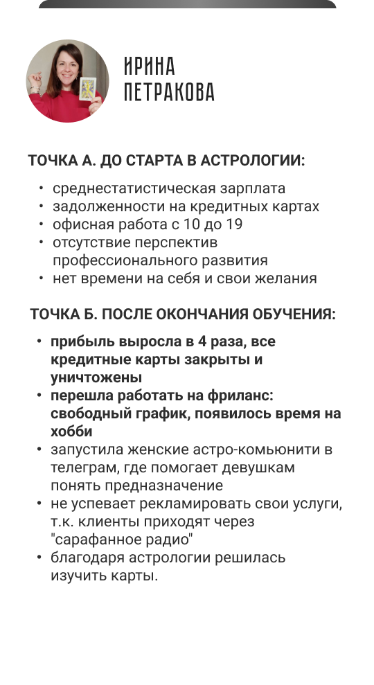 Я Ирина Чукреева и астрология - моя большая страсть, которая разделила мою жизнь на “до” и “после”. Когда-то я была простой Омской девчонкой, которая, как и многие мои сверстницы, одевалась на китайском рынке, мерзла на остановках в ожидании маршруток и подрабатывала продавцом, чтобы накопить на свои хотелки. С тех пор утекло много воды, я пробовала разные направления деятельности и бизнес-проекты, но более 10 лет назад я начала развиваться в астрологии.